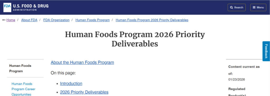 2026年1月23日,美国食品药品监督管理局(FDA)发布了人类食品项目2026年优先工作重点(Human Foods Program 2026 Priority Deliverables),涵盖食品化学安全、营养健康、微生物食品安全等多个核心领域。