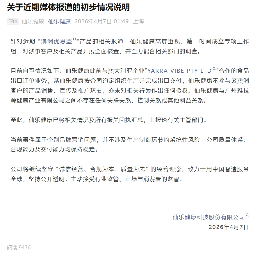 4月7日,仙乐健康微信公众号针对近期“澳洲优思益”产品的相关报道作出回应称,当前事件属于个别品牌营销问题,并不涉及生产制造环节的系统性风险,公司质量体系、合规能力及交付能力均保持稳定。
